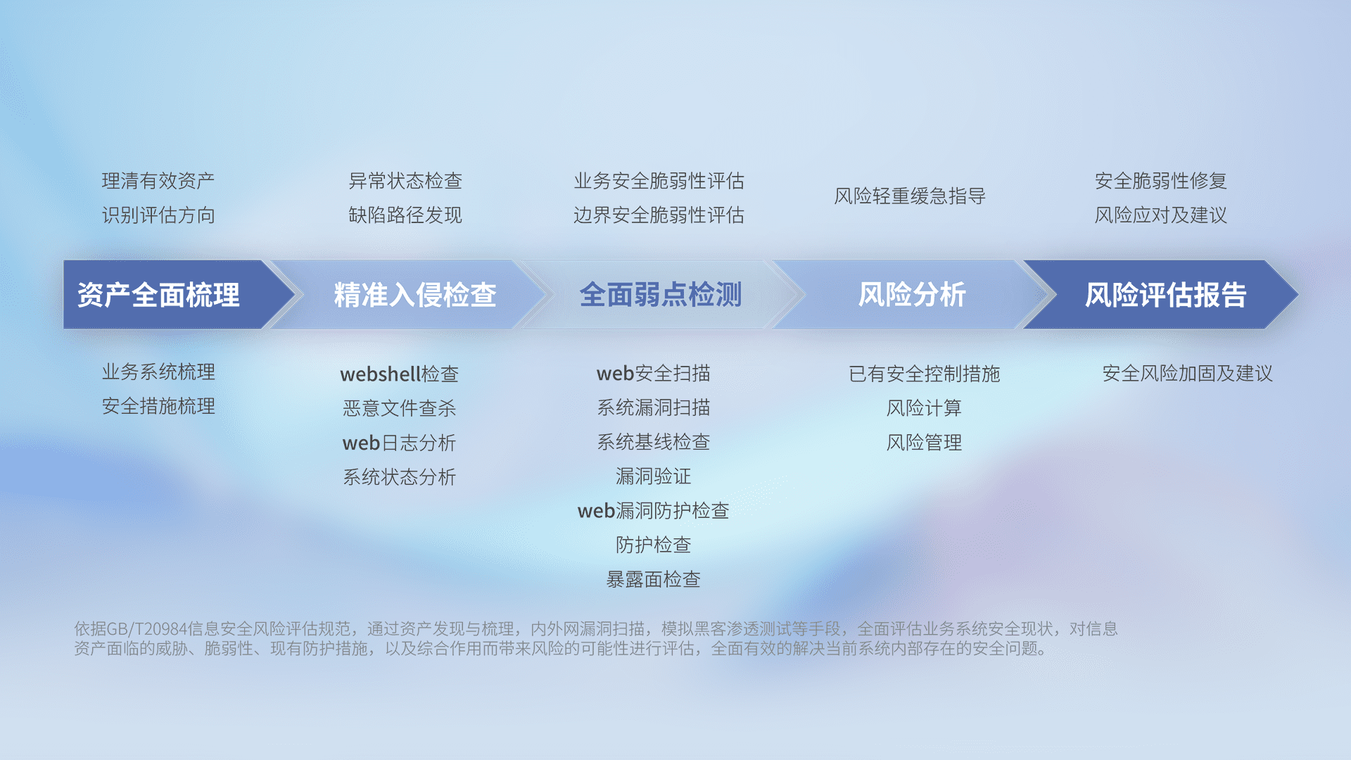 针对客户行业特性,,,,以专业的安全服务+多厂商联合解决方案提供专属的一站式安全管理服务,,帮助客户全面感知网络空间威胁,,基于识别、、、检测、、、分析、、、、防护、、、监测、、、响应的服务理论模型,,从方案咨询、、集成交付、、评估验证、、、、优化加固、、、运维运营,,,致力于为客户提供完整的闭环管理式安全服务。。。。以实战经验为客户打造高抵御风险的安全体系,,,帮助客户发现威胁、、、、对抗威胁、、、处置威胁,,,,不断积累安全对抗能力,,,,持续保障数字化安全。。